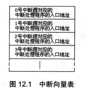 中断向量表在内存中存放,对于8086PC机,中断向量表指定放在内存地址0处。从内存0000:0000到0000:03FF 的1024 个单元中存放着中断向量表。一个表项存放一个中断向量,也就是一个中断处理程序的入口地址,对于8086CPU,这个入口地址包括段地址和偏移地址,所以一个表项占两个字,高地址字存放段地址,低地址字存放偏移地址。