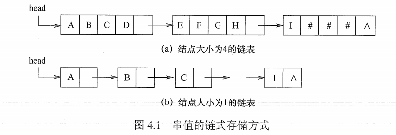 也可采用链表方式存储串值。由于串的特殊性(每个元素只有一个字符),在具体实现时,每个结点既可以存放一个字符, 也可以存放多个字符。每个结点称为块,整个链表称为块链结构。最后一个结点占不满时通常用“#”补上。