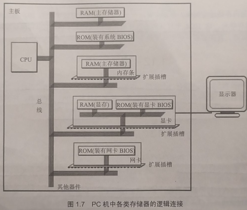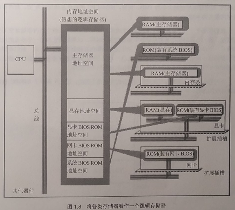 在图1.8中,所有的物理存储器被看作一个由若干存储单元组成的逻辑存储器,每个物理存储器在这个逻辑存储器中占有一个地址段,即一段地址空间。CPU在这段地址空间中读写数据,实际上就是在相对应的物理存储器中读写数据。