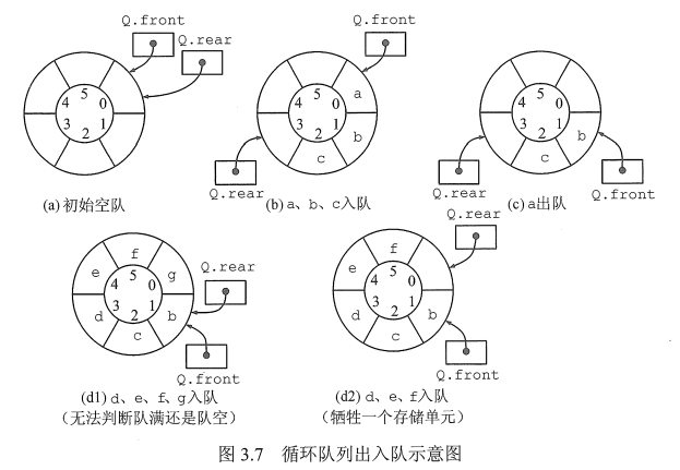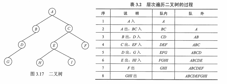 逐层\逐行处理(广度优先遍历)。这类问题的解决方法往往是在处理当前层或当前行时就对下一层或下一行做预处理,把处理顺序安排好,待当前层或当前行处理完毕,就可以处理下一层或下一行。使用队列是为了保存下一步的处理顺序。表3.2显示了层次遍历二叉树的过程。